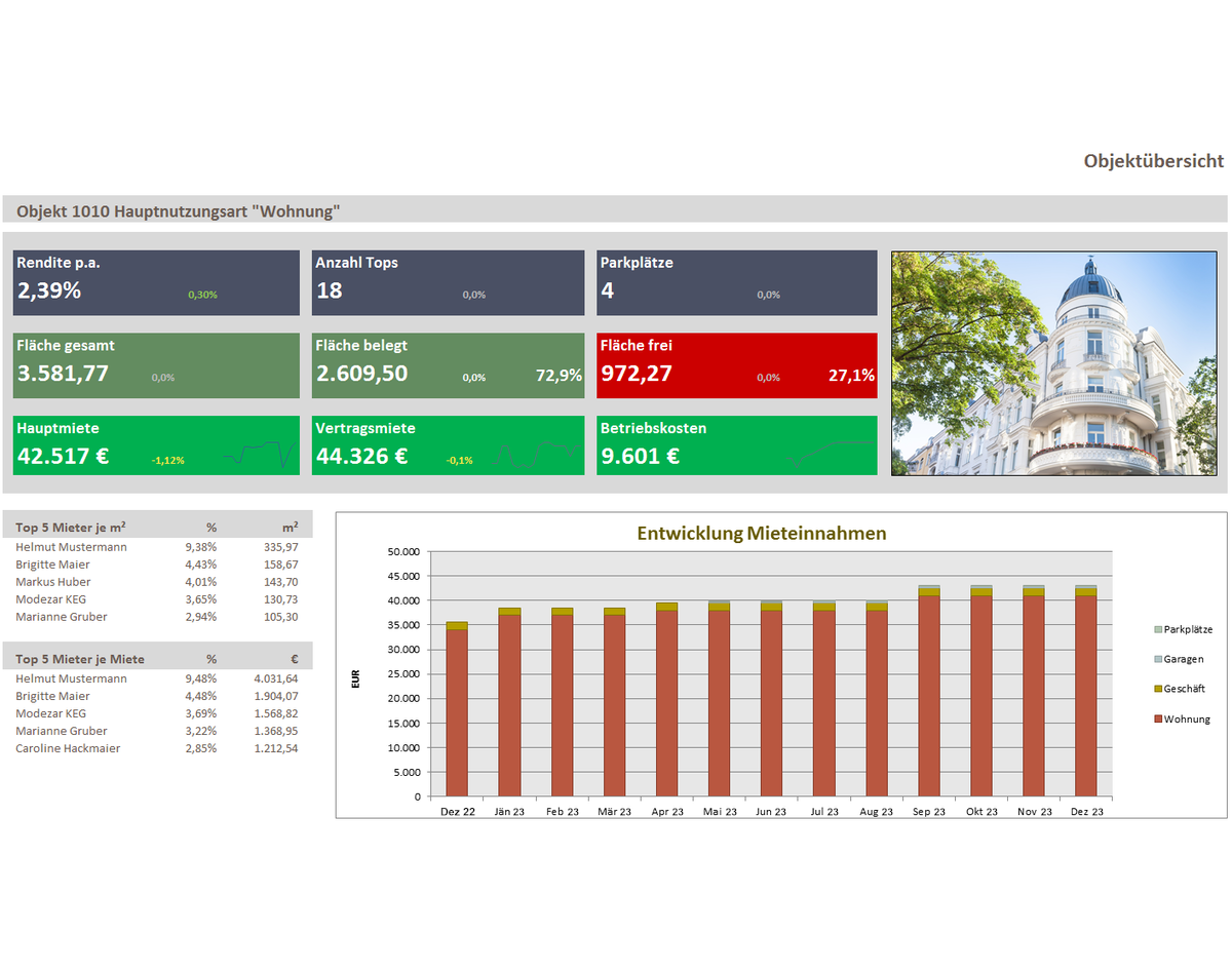 Die enthaltenen Berichte bieten Aggregationsstufen vom Gesamtportfolio über Teilportfolios und Einzelobjekte bis zu individuellen Mietern, Bestandseinheiten und Zahlungsposten.